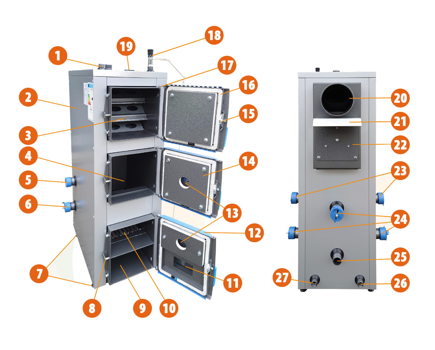 Konstrukcja oparta jest o wymiennik z poziomymi kanałami konwekcyjnymi. W dolnych drzwiczkach zaprojektowana została klapka, której pozycja regulowana jest poprzez miarkownik ciągu Regulus. Stosowany opał to drewno w postaci polan umieszczanych w komorze palniska jednorazowo przed rozpoczęciem spalania. Wylot komina (czopuch) umieszczony jest z tyłu kotła.