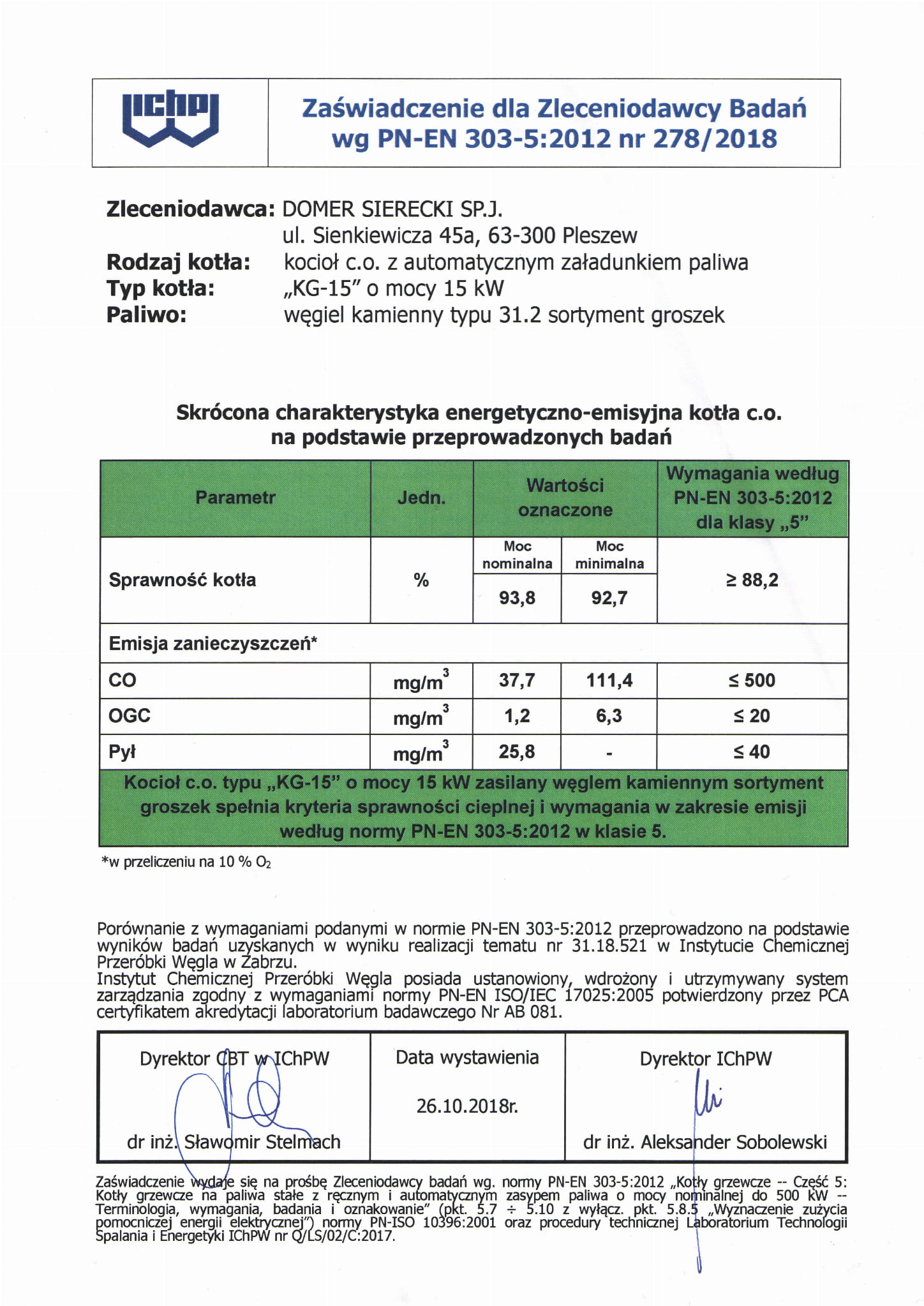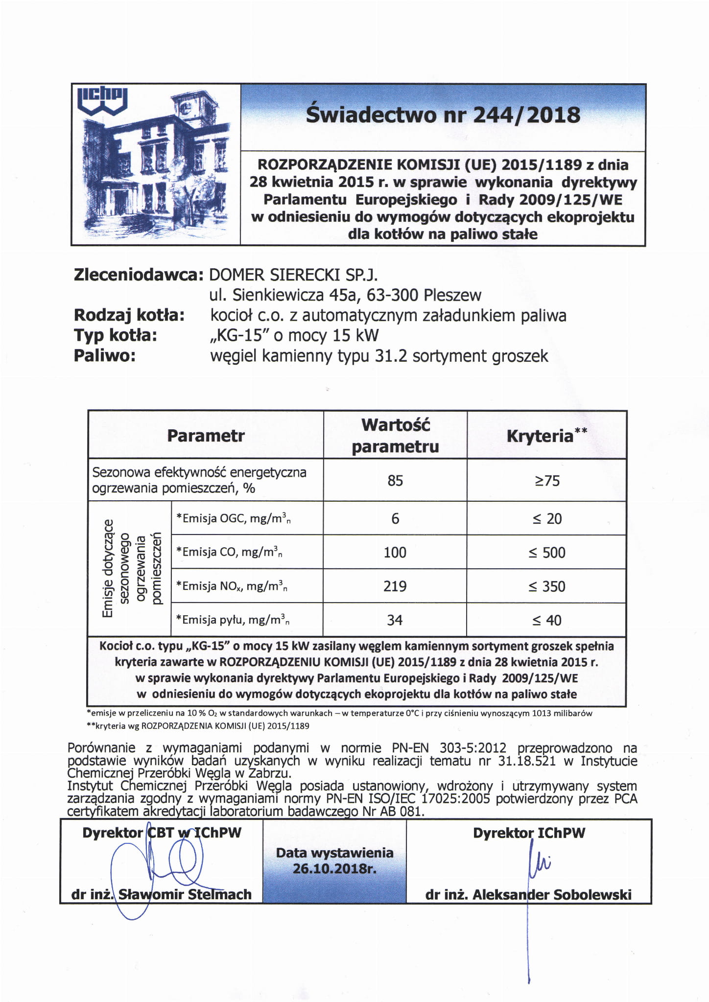- atest potwierdzający zgodność z normą PN-EN 303- 5:2012 - 5 klasa i Ecodesign