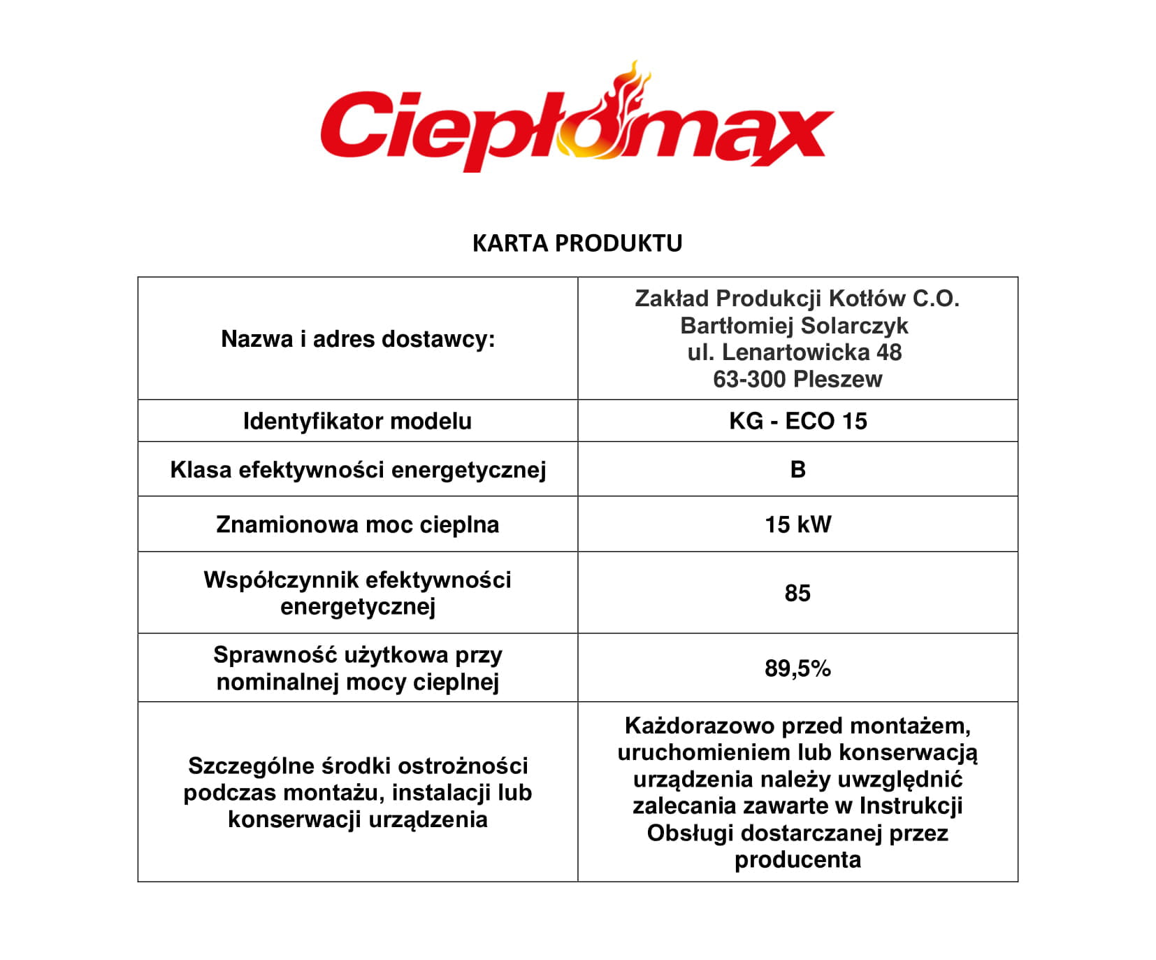 Kocioł c.o. 15kW ogrzewa 100-150m2 KG-ECO z podajnikiem ślimakowym Pancerpol na ekogroszek Ciepłomax Pleszew 5 klasa / Ecodesign