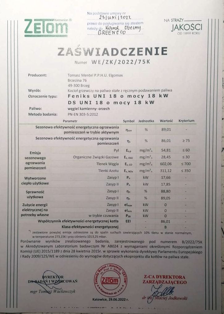 Kotły spełniają wymagania energetyczno-emisyjne 5 klasy normy PN-EN 303-5:2012 oraz Ecodesign - Ekoprojekt.