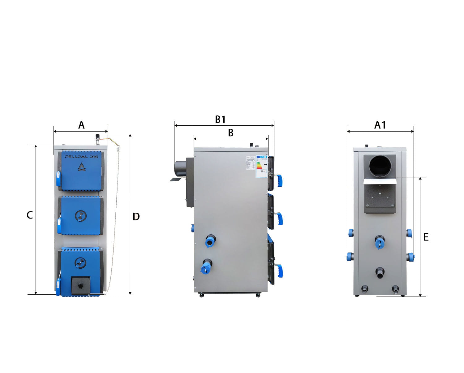 Wymiary kotła PELLPAL D o mocy 20 kW: